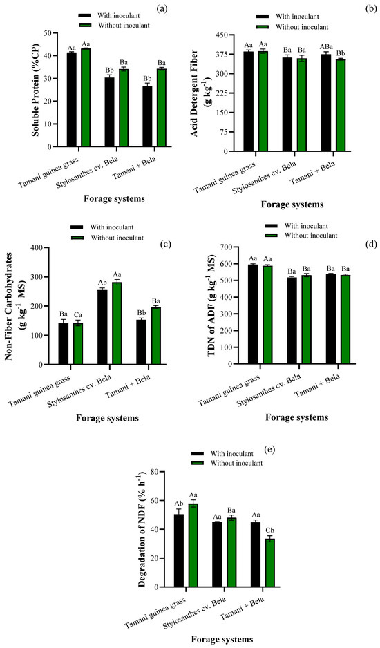 Interaction between forage systems and ensiling methods (with and without inoculant) for the contents of soluble protein, acid detergent fiber (ADF), non-fiber carbohydrates (NFC), TDN-ADF (total digestible nutrients of acid detergent fiber), and NDF degradability in the different silages. Same uppercase letters in the black columns (inoculant treatment), do not differ from each other by the Tukey test (p < 0.05). Same uppercase letters in the green columns (no inoculant treatment), also do not differ from each other by the Tukey test (p < 0.05). Furthermore, same lowercase letters, within each forage system (Tamani guinea grass, Stylosanthes cv. Bela or Tamani + Bela), do not differ from each other by the Tukey test (p < 0.05).