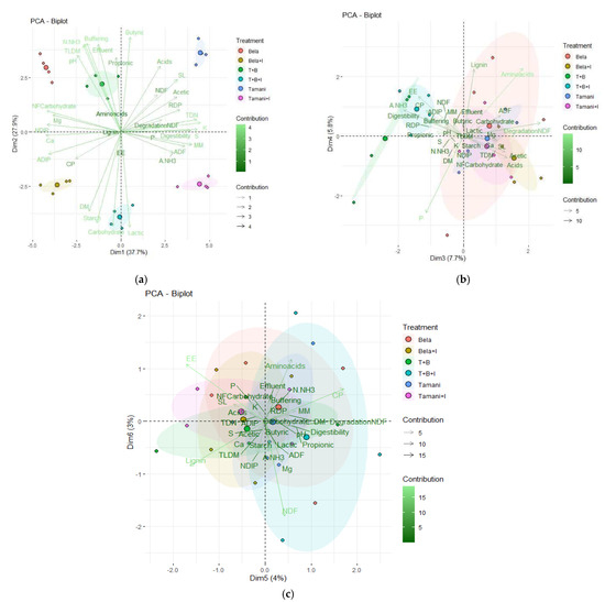 Two-dimensional scatterplots of the principal component analysis for the first and second (a), third and fourth (b), and fifth and sixth (c) principal components, showing the scores for 34 variables related to fermentation characteristics and the nutritional value of Tamani guinea grass and Stylosanthes cv. Bela silages in monoculture and consortium with and without inoculant. Treatments: Tamani (Tamani guinea grass monoculture silage without inoculant), Tamani + I (Tamani guinea grass monoculture silage with inoculant), Bela (Stylosanthes cv. Bela monoculture silage without inoculant), Bela + I (Stylosanthes cv. Bela monoculture silage with inoculant), T + B (consortium silage of Tamani guinea grass + Stylosanthes cv. Bela without inoculant), T + B + I (consortium silage of Tamani guinea grass + Stylosanthes cv. Bela with inoculant). DM: dry matter; pH; N.NH3: ammoniacal nitrogen; A.NH3: ammonia NH3; Buffering: buffering capacity; TLDM: total dry matter losses; Effluent: effluent production; CP: crude protein; ADIP: acid detergent insoluble protein; NDIP: neutral detergent insoluble protein; SL: soluble protein; ADF: acid detergent fiber; NDF: neutral detergent fiber; Lignin; Carbohydrate: soluble carbohydrate; Starch; EE: ether extract; MM: mineral matter; Ca: calcium; P: phosphorus; Mg: magnesium; K: potassium; S: sulfur; Lactic: lactic acid; Acetic: acetic acid; Propionic: propionic acid; Butyric: butyric acid; Acids: total acids; NFCarbohydrate: non-fiber carbohydrates; TDN: total digestible nutrients; DegradationNDF: NDF degradability; Aminoacids; Digestibility: total FDN digestibility; RDP: rumen degradable protein.