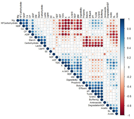 The correlation analysis (Figure 5) revealed positive correlations ranging from low to high among P, NDF, ADF, TDN, K, S, A.NH3, RPD, MM, Digestibility, and Propionic. These variables showed negative correlations, ranging from low to high, with Mg, NFCarbohydrate, NDIP, Ca, CP, ADIP, DM, Starch, and Carbohydrate. Variables such as Propionic, Butyric, pH, TLDM, N.NH3, Buffering, and Amino acids were positively correlated among themselves (moderate to high) and negatively correlated with DM, Starch, Carbohydrate, and Lactic acid.