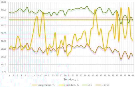 This experiment was started on 21 June 2022 at Yongning County, Yinchuan City, Ningxia Hui Autonomous Region. The ambient temperature and humidity were automatically recorded at intervals of every 10 min by means of automatic temperature and humidity recorders (Shanghai Penghe Electronic Technology Co., Ltd., Shanghai, China). The temperature-humidity index (THI) was calculated according to the method proposed by Oliveira et al. []. Based on previous studies, THI ≥ 68 was designated as the threshold signifying the onset of heat stress [,].