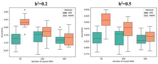 Comparison between KRR and WKRR on the simulated datasets with various numbers of causal SNPs and heritability in linear genetic architecture. For each box, the middle line represents the means, and the bottom and top represent the standard deviations. Trait heritability (h2) was 0.2 or 0.5, while the number of causal SNPs was 50, 200, and 500.