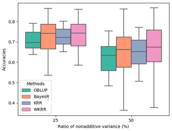 To verify the performance of WKRR in mixed genetic architecture with nonlinear effects of epistasis, four models (GBLUP, BayesR, KRR, and WKRR) were fully compared with the simulation dataset considering nonlinear effects. In this part, the phenotypes were simulated with heritability equal to 0.35. Interestingly, WKRR was superior to all other three models, and the advantages became more obvious as the ratio of non-additive variance increased (Figure 2). It could be concluded here that the weighted nonparametric nonlinear model was a better choice compared to parametric models. Although there were non-additive effects in the genetic background, unweighted KRR performed slightly worse than BayesR, which indicated that the fitting ability of unweighted nonparametric models was strongly influenced by the distribution of SNPs’ effects. It should be noted that the standard deviations of accuracies for BayesR and WKRR were large (Table S3), which highlighted the necessity of a more careful parameter tuning process for more stable prediction. Generally, the results demonstrated that WKRR could effectively fit the mixture distribution for SNPs’ effects with both additive and non-additive architecture.
