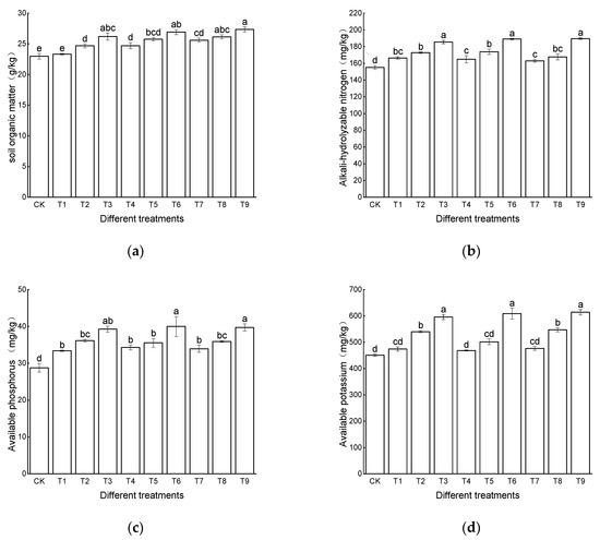 3.5. Effect of Biochar-Based Organic Fertilizer on Organic Matter and Nutrient Content of Cadmium-Contaminated Soil
