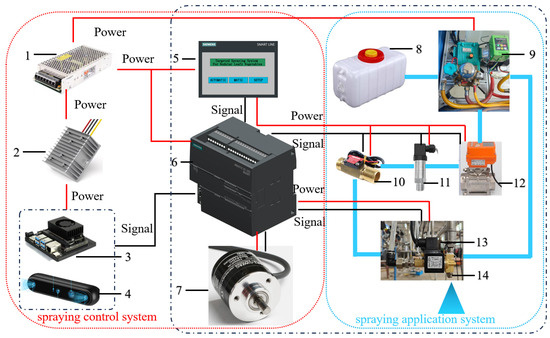 This is a schematic diagram of the targeted spraying system. 1. regulated power supply, 2. voltage reducer, 3. edge computing unit, 4. binocular camera, 5. human–computer interaction interface, 6. PLC controller, 7. optical rotary encoder, 8. water tank, 9. water pump, 10. flow sensor, 11. pressure transmitter, 12. electric ball valve, 13. two-position, three-way solenoid valve, 14. flat-fan nozzle.