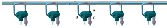 This system is designed to advance the development of precision agriculture in China and align with international advancements in precision spraying technologies. To achieve this, the system utilizes entirely domestically produced components for the spraying device. However, this design faces the challenge of significant pressure fluctuations and unstable spraying performance. To address these issues and ensure stable operation during spraying, a pressure-stabilizing spraying device has been developed. The purpose of the device is to ensure pressure stabilization during the application of the pesticide to the target, thereby ensuring uniform targeted spraying and consistent droplet deposition. The pressure-stabilizing pesticide spraying device is divided into two main units: the pesticide supply unit and the pesticide spraying unit. The structure of the pressure-stabilized pesticide spraying unit is shown in Figure 3. The pesticide supply unit is responsible for delivering the liquid to the pesticide spraying unit. The piston pump transfers the liquid from the pesticide tank to the spraying pipeline. The main spraying pipeline branches into five sub-lines, each equipped with a two-position, three-way solenoid valve and a flat-fan nozzle. A is the water inlet, and B and C are the water outlets. The workflow of the spraying system is that when inactive, the A port is connected to the B port, causing the liquid to recirculate back into the system while the C port remains closed. When active, the A port connects to the C port, and the recirculation path is closed, allowing spraying through port B. This design ensures that the spraying system maintains stable pressure by enabling a one-inlet, one-outlet flow rate configuration in both operational modes. The working principle of the system is based on the two-position, three-way solenoid valve, which operates with one inlet and two outlets. Both ports, B and C, have the same aperture size, ensuring that the output flow rate remains constant. This structure enables the spraying system to maintain a stable total system pressure, even when operating under variable conditions.