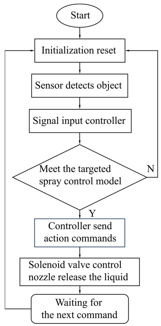 The PLC controller, as the core component, is responsible for receiving target information and issuing control commands. The system operates with a refresh frequency of 100 ms to collect real-time data from the encoder, electric ball valve, pressure transmitter, and flow sensor. The encoder’s A and B phases are connected to the I0.0 and I0.1 input ports, respectively. The A and B phases of the encoder are two pulse signals that are 90 degrees out of phase with each other. The A phase provides the primary pulse, while the B phase helps determine the direction of rotation based on which phase leads or lags the other. The use of an incremental encoder allows the rotary encoder’s pulse signals to be directly transmitted to the PLC, which counts the pulses using the PLC’s high-speed counter to obtain positional data. This enables precise control of the solenoid valve to ensure it opens only when the nozzle is positioned over the crop. The pressure transmitter is connected to the analog expansion module, providing real-time system pressure measurements and converting the analog signals into digital format for continuous monitoring and adjustment by the PLC. The electric ball valve regulates the flow rate of pesticide in the system, controlling both pressure and flow rate by adjusting the valve opening, ensuring stable pesticide application. In case of excessive system pressure, the ball valve opens fully to relieve pressure rapidly, protecting the pipeline and preventing potential damage or leakage, as well as ensuring the proper functioning of the solenoid valve and sensors [23]. Additionally, the flow sensor drives a turbine through the water flow rate, generating pulse signals. The PLC calculates the real-time flow rate from these pulse signals, thereby ensuring precise control over pesticide spraying. Each spraying branch is equipped with an independent solenoid valve controlled by the PLC to perform intermittent spraying based on crop position, enabling targeted spraying and minimizing pesticide waste. The main technical parameters of the system are shown in Table 1.