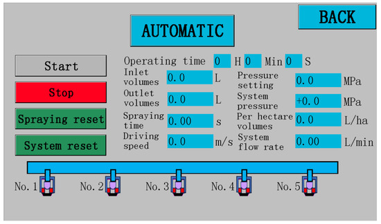 The overall flow rate of the targeted spraying system is shown in Figure 4. The Human–Machine Interface (HMI) panel serves as the primary interface for program control and system debugging, facilitating communication with the PLC via Ethernet. Real-time data on the pressure and flow rate of the spraying system are accessible through the pressure transmitter and flow sensor displayed on the HMI, and the HMI interface is illustrated in Figure 5. The operator can set the opening of the electric ball valve through the HMI to adjust the pressure of the spraying system, obtain a stable system pressure, and provide real-time feedback on the spraying status of the nozzles and operating data on the spraying system. The operation process of the system is as follows. First, the operator sets the pressure of the spraying system via the HMI and configures the distance between the camera and the nozzle. In manual mode, a pre-test operation of each nozzle is conducted to ensure that all nozzles can spray the liquid normally, thereby ensuring optimal system performance in automatic mode. In automatic mode, the spraying system is activated, and the target crop information is transferred to the lower control system once the upper computer detects the crop. The application control model is then programmed into the PLC control system, which provides feedback on the nozzles’ position through the encoder. When the nozzle is directly above the target, the PLC sends a command to the relay, activating the relay coil to control the solenoid valve coil, which releases the pesticide from the nozzle. This feedback mechanism ensures the accurate application of the pesticide to the target. The system then awaits further commands from the upper computer to ensure the control model’s requirements are met. During the spraying process, the PLC collects data from the pressure transmitter and flow sensor in real-time, continuously calculating and adjusting the working parameters of the spraying system to maintain stability and accuracy. Throughout the entire process, the PLC works in close coordination with the host computer and the HMI interface to enable the automatic detection of the crop target, precise nozzle positioning, and automated control of the spraying process. The high level of integration between hardware and software allows the system to precisely control the spraying process, optimize resource utilization, reduce chemical waste, and improve the effectiveness of crop protection.