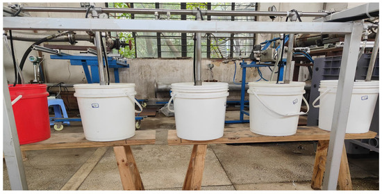 To evaluate the performance of the spraying system under different operating conditions, the spray pressure was set to 0.3 MPa, 0.4 MPa, and 0.5 MPa based on the equipment parameters and the field application conditions. The number of nozzles opened under each pressure was varied, with different nozzle combinations tested. Bench tests were conducted in the laboratory to simulate field-targeted spraying conditions. During testing, the nozzle was intermittently opened, with each spray duration set to 0.4 s, repeated 150 times, for a total spray time of 1 min, the duty cycle of 0.5. This setup was used to measure the target flow rate. For constant flow rate, one nozzle was operated for the entire duration of the 1-min spray time. HMI was set to refresh every 100 ms to record real-time data from the flow sensor. The difference between water inlet (port A) and water outlet (port C) flow rate to obtain the spraying volumes. Simultaneously, a container was placed beneath the nozzle to measure the applied amount using a weighing method, as shown in Figure 6. All data were collected and repeated three times to ensure accuracy, with the final values averaged across both measurement methods.