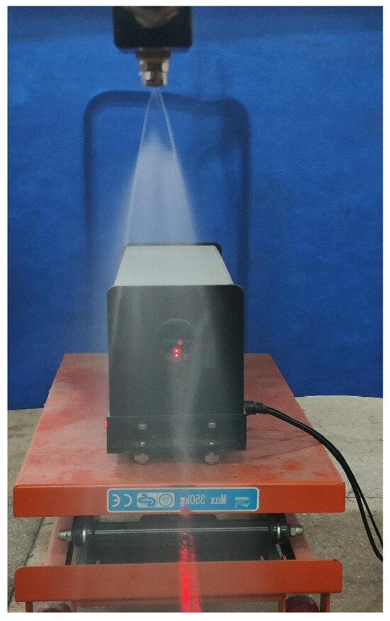In this experiment, tap water was used as the test solution, and the system pressures were set to 0.3 MPa, 0.4 MPa, and 0.5 MPa. The measurement durations were 0.5 s and 15 s. The measurement device has a minimum measurement time of 0.5 s and a maximum measurement time of 15 s. Consequently, a measurement time of 0.5 s captures transient behavior, while a measurement time of 15 s reflects stabilized conditions. The distance between the transmitter and the receiver of the laser particle size analyzer was 120 cm. To ensure complete atomization of the liquid droplets, the nozzle was positioned at the midpoint between the laser transmitter and receiver, with a distance of 35 cm from the nozzle to the laser beam, as shown in Figure 7. To enhance the reliability of these experimental data, each measurement was conducted in triplicate, with a minimum of 10,000 droplet data points collected per measurement [29,30,31]. Throughout the experiment, the room temperature was maintained at (20 ± 2) °C and the relative humidity at (45 ± 8)%, which met the environmental conditions required for accurate droplet size measurements.