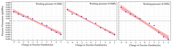Under a given set pressure, the system experienced pressure fluctuations each time a nozzle was opened or closed. The results revealed that as the Δn increased during targeted spraying, the pressure fluctuation also increased, reaching up to −0.008 MPa. Conversely, as the number of closed nozzles increased, the pressure fluctuation grew, reaching up to +0.006 MPa based on experimental measurements. When opening or closing different numbers of nozzles, the pressure fluctuated with magnitudes proportional to |Δn|. Specifically: