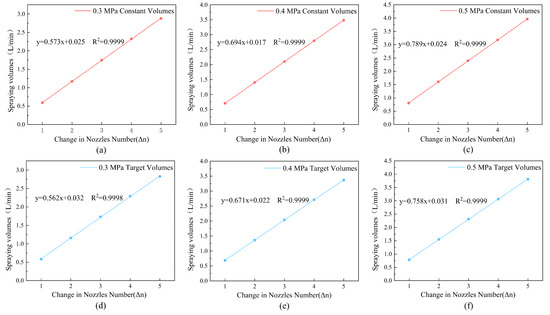 At pressures of 0.3 MPa, 0.4 MPa, and 0.5 MPa, the spray application flow rate increases with the ∆n. A model describing the relationship between change in nozzle number and nozzle flow rates was established, as shown in Figure 9. By fitting these data with a linear regression function, the parameters of the fitted equations are presented in Table 3. All significance levels were much lower than 0.05, suggesting a strong positive correlation between change in nozzle number and nozzle flow rates. The R2 value, close to 1, indicates a good fit. The nozzle flow rate is minimally affected by system pressure fluctuations, further confirming the system’s stability.