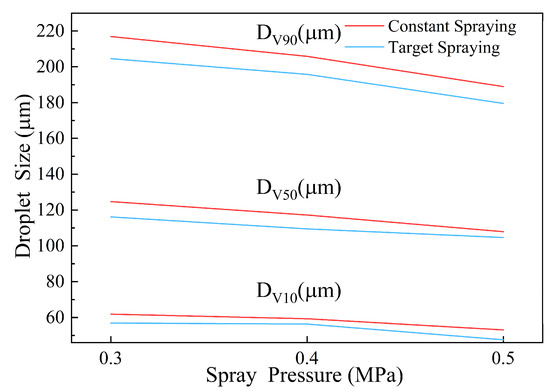 The droplet diameter measurement was performed using the DP-02 laser particle size analyzer (OMEC Instruments Co., Ltd., Zhuhai, China). This device comprises a laser transmitter, a laser receiver, and a data processing system. It characterizes the particle size and distribution by analyzing the intensity distribution of different diffraction patterns collected by the detector. The measurement range of the laser particle size analyzer is from 1 to 1500 μm, with a repeatability accuracy of ±3% [25]. Droplet size is a critical parameter in assessing droplet atomization characteristics. The key indicators of droplet size include the volume diameter (, , and ), the percentage of droplets smaller than 150 μm relative to the total atomized volume (), and the relative span (RS) of the droplet size distribution. Among these, known as the volume median diameter, is widely regarded as the most significant indicator of droplet size [26]. Droplets smaller than 150 μm have a reduced relative surface area, exhibit higher volatility, are prone to drift, and thus require mitigation measures such as anti-drift masks [27]. The relative span of the droplet size distribution quantifies the breadth of the distribution, serving as an indicator of the uniformity of droplet atomization [28]. It is calculated using the following formula: