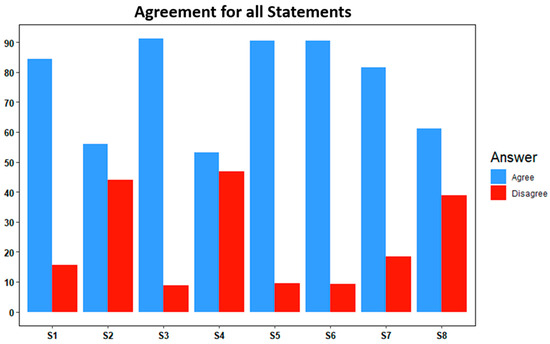 For the descriptive analysis, a graphic was used to help visualize the percentage of agreement for each statement. Here, we did not split the categories. Figure 1 represents the proportion of agreement for all statements. Here, for all statements, the agreement was more than 50%, and S2, S4, and S8 resulted in the highest disagreement rate, coming in at more than 40%. On the other hand, S1, S3, S5, S6, and S7 resulted in more than 80% agreement.