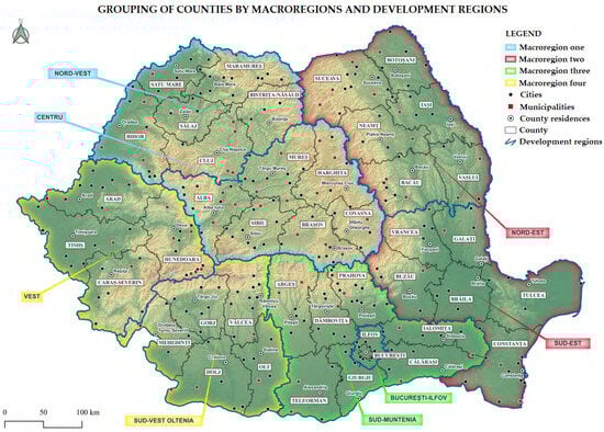 Romania, as an EU member state, is required to comply with EU regulations regarding territorial organization that arise from European legislation. Currently, Romania is organized according to the 1991 Constitution and the Local Public Administration Law No. 69/1991 into the following basic administrative units: counties (41), municipalities (97), cities (268, including municipalities), communes (2698), and villages (13,089). Since 1998, four macro-regions (NUTS-I), eight regions (NUTS-II), 41 counties, and the municipality of Bucharest (NUTS-III) have been established in accordance with the EU NUTS Nomenclature. Figure 1 graphically represents the macro-regions and development regions of Romania, which serve as the basis for the data analyzed and presented in this article.