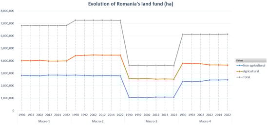 Evolution of the land fund of Romania between 1990 and 2022 (ha). Source: processing based on own data and [56,57].