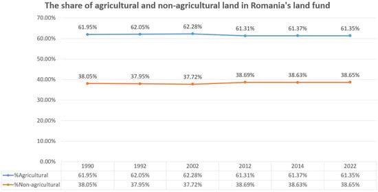 Share of agricultural and non-agricultural land in Romania’s land fund. Source: processing based on own data and [56,57].