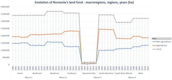Figure 6 shows the evolution of the land fund of Romania, with details at the macro-region and region level.