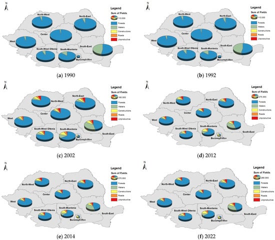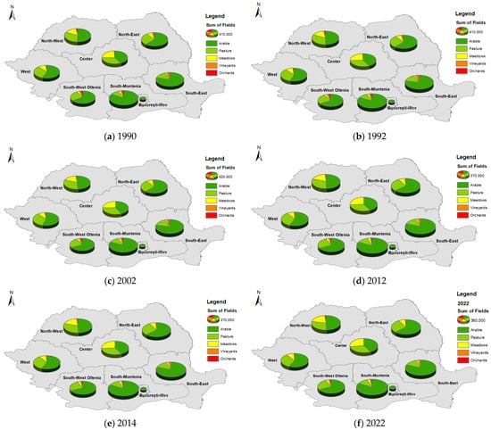 Until the completion of the land registration process by the National Agency for Cadastre and Land Registration (ANCPI), official data series remain with values corresponding to the year 2014 [47,56]. Consequently, for the period between 2014 and 2022, no data have been collected, centralized, or reported regarding the evolution of Romania’s land fund, making it impossible to effectively manage land areas and align with or conform to national strategies for agricultural and forestry development.