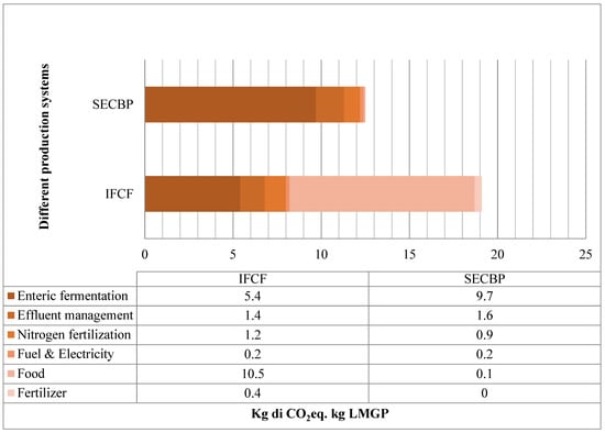 Examining the contributions of the different categories composing the CF of both systems, we can observe that, in the SECBP system, enteric fermentation was the most significant source of emissions, accounting for 72.4% of the total CF, which was 79.6% higher than in the IFCF system, in which enteric fermentation was the second-largest contributor (28.1% of the CF). However, in terms of kg CO2eq. per kg LMGP, this value was lower than in the SECBP system, because animals in the IFCF system were fed concentrated feed, which reduced enteric fermentation.