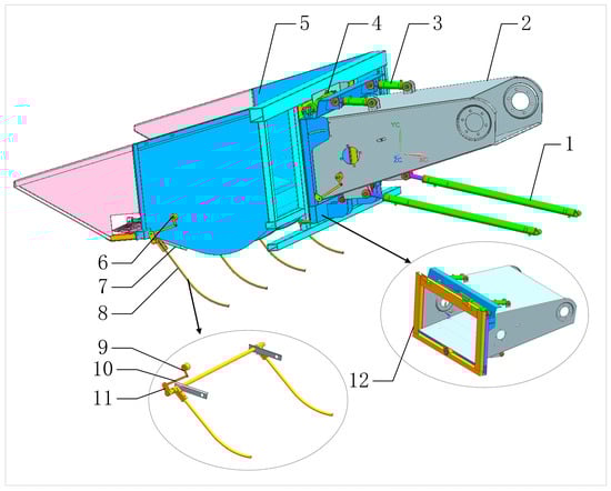 Schematic diagram of the adaptive profiling adjustment mechanism. 1. Lifting hydraulic cylinder; 2. overbridge; 3. cutting angle adjusting hydraulic cylinder; 4. horizontal swinging hydraulic cylinder; 5. header; 6. angle sensor; 7. fixing bracket; 8. profiling rod; 9. sensor driving plate; 10. connecting rod; 11. driving rod; and 12. adjusting device.