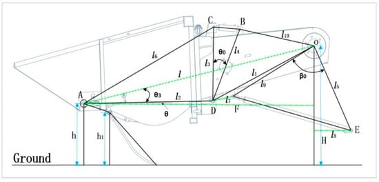 Kinematic analysis is a branch of mechanics that describes the law of change in the position of an object over time, based on the study of the motion of a mass or a rigid body; the study of the motion of an object does not involve the external forces on the object and only studies the motion response caused by these forces [19,20]. We simplify the adaptive affine adjustment mechanism as a fixed-axis rotating rigid body around the O point, in which the adjustment of the cutting angle of the reciprocating cutter is simplified as a fixed-axis rotating rigid body around the point. The imitation of the grain header in the horizontal direction is simplified as a fixed-axis rotating rigid body around the point. The following were established: the imitation of the header in the vertical direction of lifting and lowering, the horizontal direction of rotary oscillation, and the front and back directions of rotary floating; three degrees of freedom of the motion relationship; the height of the cutter from the ground; the cutting angle; and the hydraulic cylinder expansion and contraction amount of the motion relationship. The simplified model of the adaptive profiling adjustment mechanism of the profiling grain header is shown in Figure 2.