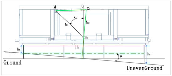 The heights and of the left and right sides of the header from the ground mainly determine the rotary swing of the profiling grain header in the horizontal direction, where is the distance between the center of the profiling rods on the outside of the profiling mechanism mounted on the bottom left and right sides of the header, is the horizontal angle of the header from the ground (i.e., the angle of change of the header from the level of the table), and is the initial angle of the fixed mounting seat of the hydraulic cylinder from the point of rotation and the movable hydraulic cylinder at the time when the header is at the horizontal position. is the initial angle of the hydraulic cylinder fixed mount from the rotation point and the hydraulic cylinder movable articulation point in the horizontal position of the cutting platform, is the initial length of the horizontal swing hydraulic cylinder, and is the adjusted length of the horizontal swing hydraulic cylinder.