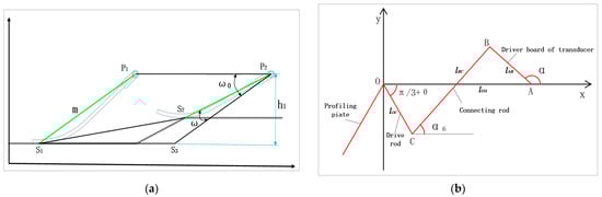 The profiling mechanism, as the source of the input signal of the control system, correlates with the amount of change in the profiling angle and the amount of change in the height of the ground and the angle of rotation of the angle sensor in the harvesting operation carried out by the grain harvester. According to the motion characteristics of the profiling mechanism, the profiling rod is dragged during the forward movement of the harvester. It will rotate under the action of the support force of the undulating terrain, generating the profiling angle . After a particular slope, the motion state is shown in Figure 4a [21].