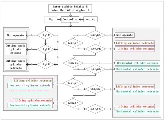 According to the above analysis, before the grain imitation header carries out field harvesting operations, the operator initializes the working state of the header by manually inputting the stubble height h of the crop to be harvested and the cutting angle of the cutter. In carrying out the harvesting operation, the angle sensor installed between the header and the overbridge collects the cutting angle in real-time; the profiling mechanism installed at the bottom of the header profiles the terrain anywhere and determines the terrain condition by the angle between the profiling rod and the horizontal plane; the profiling angle sensors are installed at the two sidewalls and collect the state information of the profiling mechanism in real time (the profiling angles and ) and transmit this information through an electrical signal to the controller. The controller analyzes the algorithm after receiving the signal and then adjusts the header according to the control strategy of the profiling header, as shown in Figure 5.