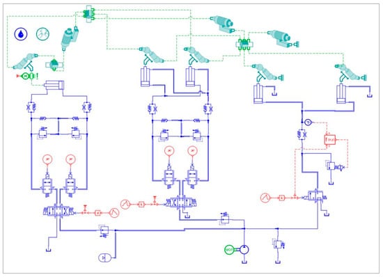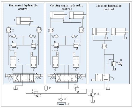 As shown in Figure 6, the hydraulic drive system mainly includes a primary circuit and three sub-circuits. The primary circuit contains hydraulic pumps, safety valves, and accumulators, and the sub-circuits are mainly composed of lifting hydraulic cylinders, front and rear floating hydraulic cylinders, and horizontal swing hydraulic cylinders, which are automatically controlled by adaptive control algorithms. The horizontal swing cylinder and the front and rear floating hydraulic cylinders are controlled by a three-digit four-way electromagnetic reversing proportional valve to control the horizontal rotation of the profiling table and the adjustment of the front and rear cutting angles. Moreover, the lifting hydraulic cylinder is controlled by a two-digit three-way electromagnetic reversing proportional valve to control the vertical lifting and lowering of the profiling table [22]. Considering the harsh working environment of the copycat header, the circuit is designed with a pressure-reducing valve, safety valve, and buffer valve to reduce the impact and pulse generated by the hydraulic system, effectively reducing vibration and noise. The primary role of the one-way relief valve is to improve the stability of the hydraulic system; when the system pressure exceeds the pressure value set by the one-way relief valve, the valve port opens, the oil overflows back to the tank, thus restricting the further increase in system pressure and playing a protective role [23]. In addition, the accumulator in the hydraulic system can optimize the response time and stability of the hydraulic circuit by adjusting the volume and pressure of the stored pressurized fluid [24]. Grain combine harvester in the process of harvesting operations, according to the received profiling mechanism and the cutting platform, sends the signal for calculation and comparison, and then the results of the calculations in the form of electrical signals are transmitted to the three hydraulic circuit solenoid valves. Furthermore, the controller solenoid valves are turned on and off to regulate the expansion and contraction of the hydraulic cylinders, and the profiling of the header platform is controlled with the ground profiling.