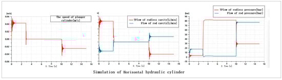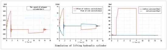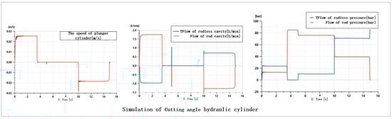 The three-dimensional digital model is imported into the software, and the hydraulic module and the 2D mechanical module are used for co-simulation analysis. The motion laws of the header lifting plunger cylinder, the horizontal swing plunger cylinder, and the front–rear floating plunger cylinder are analyzed, and the dynamic performance of the hydraulic system is evaluated.