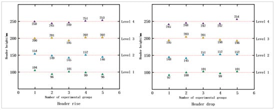 The cutter angle was set to 0° in all experiments, and according to the test results in Table 2, it can be seen that the results of the control system for the regulation of the cutter table profiling are consistent with the objectives of the repeatability test and that the control error fluctuates less. The errors are within the range of −5 mm to 5 mm. The MAEVs used for header profiling control are 2.5–3 mm and 2–3.5 mm, and their average relative errors are 1.61% and 1.59%, respectively. The average response time of the profiling system is in the range of 0.50–0.90 s and 0.60–0.90 s.