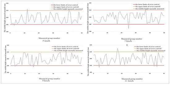 To verify the stability and accuracy of the adaptive profiling cutter control system, the average stubble height L, the coefficient of variation of stubble C (V), and the height control accuracy of the cutter τ will be used as the evaluation indexes of the field test. L is used for evaluating the overall deviation of the actual stubble height from the set stubble height, C.V is used for assessing the stability of the system work, while τ is used for evaluating the distribution of the actual stubble height in the allowed error range of the ratio in order to assess the regulation accuracy of the system [25]. Before the test, wheat demonstration field with uneven and highly undulating terrain was selected. A benchmark was inserted every 20 m for the harvesting operation. Then, a tape measure was used to record and collect 50 sets of stubble heights after harvesting. Stubble height statistics for combine harvesters at 5, 7, 9, and 11 km/h speeds are shown in Figure 13.