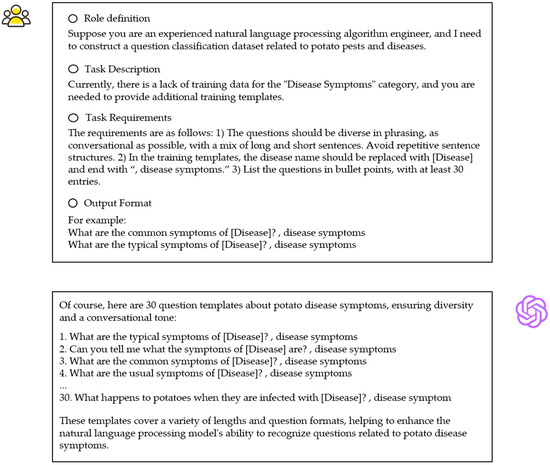 After generating various question templates using the LLM, a manual review of each template was conducted to assess alignment with question topics and human linguistic conventions. Templates that were deemed irrelevant were excluded. Finally, we bulk-imported the potato pest and disease entities extracted from the previous NER work to replace the placeholders in the templates. Using the data from the “disease symptoms” category as an example, the algorithmic logic is shown in
