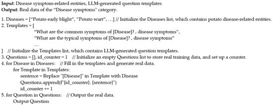 Three lists—Diseases, Templates, and Questions—were initialized. The Diseases and Templates lists store potato disease entities and question templates, respectively, while the Questions list is initially empty and is used to store the generated real data. The algorithm iterates over the Diseases list externally and the Templates list internally. During each iteration, the algorithm identifies placeholders in the templates and replaces them with the corresponding disease entities, generating a real data. Simultaneously, a counter assigns a unique identifier to each question to facilitate the subsequent counting of questions in that category. Finally, by iterating through the Questions list, all real data for the “disease symptoms” category can be obtained.