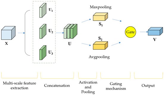 X, the model first applies three convolutional kernels of different sizes to extract multi-scale information, resulting in feature maps