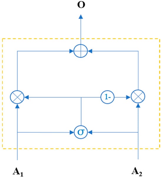 In summary, given inputs A1 and A2, the two are first linearly transformed via learnable parameter matrices w1 and w2, respectively. The transformed results are then element-wise added together to generate interaction features. These features are subsequently mapped to the interval (0, 1) using a sigmoid function, forming a weight matrix B. This weight reflects the importance of A1 across various feature dimensions, while the weight of A2 is automatically assigned as 1-B. The final output O is obtained by computing the weighted sum of A1 and A2 with weights B and 1-B, respectively. The gated fusion unit models the interaction relationships between inputs in a parametric manner, enabling fine-grained feature adaptive fusion. The normalization constraint further prevents redundancy or conflicts in weight allocation.