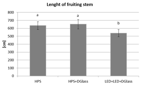 Length of the fruiting stem grown under different lighting conditions, depending on the source of artificial light and the type of glass on the glasshouse roof (HPS, HPS+DGlass, LED+LED+DGlass) (average of two years). Average values marked with the same letters were not significantly different within the analysed parameter at p < 0.05.