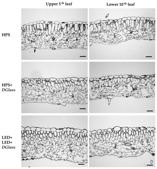 Light microscopy investigations. Tomato leaf anatomy under different light conditions depending on the artificial light source and the type of glass for the glasshouse roof (HPS, HPS+DGlass, and LED+LED+DGlass). Abbreviations: Arrow—stomata; Le—lower epidermis; Pm—palisade mesophyll; Sm—spongy mesophyll; Ue—upper epidermis; Vb—vascular bundle. Magnification = 20×. Bars = 50 µm.