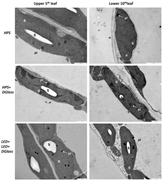 Electron micrographs of chloroplasts from the leaves of tomato plants grown under different light conditions depending on the artificial light source and the type of glass for the glasshouse roof (HPS, HPS+DGlass, and LED+LED+DGlass). Abbreviations: s—starch grain; g—granum; pl—plastoglobuli. Magnifications from the left top of the micrograph to the right are as follows: 12,000×, 15,000×, 10,000×, 10,000×, 10,000×, 10,000×. Bars = 1 µm.