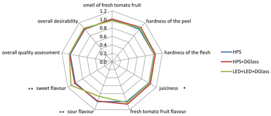 Comparison of sensory characteristics of tomato fruit treated with HPS+DGlass and LED+LED+DGlass compared with fruit from the HPS control (average of two years). Significant differences, based on Tuckey t-test, between the control and HPS+DGlass are marked by * (p = 0.05), and significant differences between HPS and LED+LED+DGlass are marked by ** (p = 0.05). The following attributes were examined: smell of fresh tomato fruit, hardness of the peel, hardness of the flesh, juiciness, fresh tomato fruit flavour, sour flavour, sweet flavour, and the overall quality assessment and overall desirability.