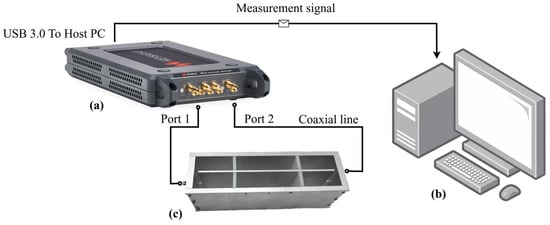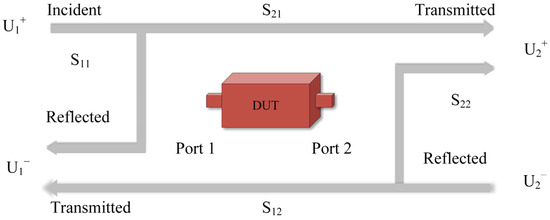 The transmission line method requires the device under test (DUT) to be placed inside a partially enclosed transmission line. The microwave network of the transmission line detection device can be described by the scattering matrix [20]. As shown in Figure 1, can be calculated by the scattering parameter .