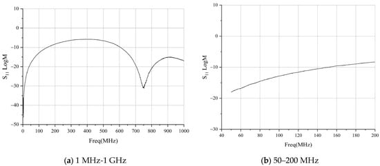 Amplitude response of the measurement platform’s S11 parameter after calibration: (a) frequency range from 1 MHz to 1 GHz; (b) frequency range from 50 MHz to 200 MHz.