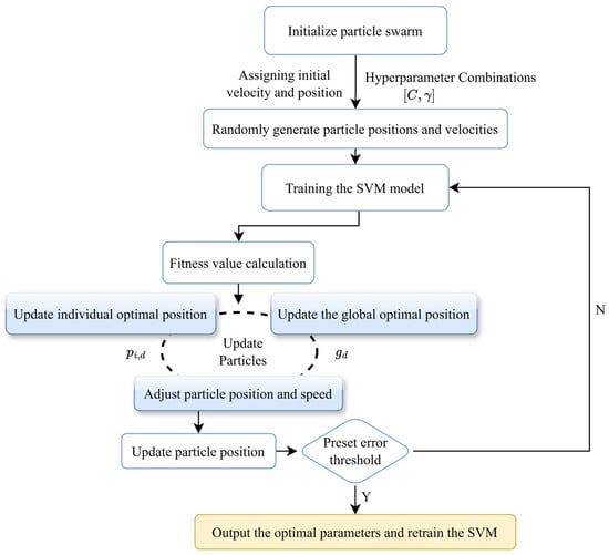 SVM-PSO is a hybrid approach that integrates an optimization algorithm with a machine learning model, effectively enhancing the performance of the SVM. PSO is utilized to optimize key parameters of the SVM, including the penalty coefficient and the kernel function parameter , thereby improving the model’s generalization ability and prediction accuracy. The workflow of this method is illustrated in Figure 5.