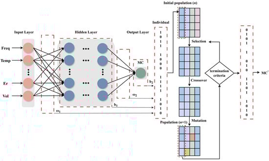 In this study, frequency, dielectric constant, volume density, and other feature dimensions are used as inputs to the BP network. The model includes nine hidden layers, and the number of neurons in each layer is configured to predict moisture content. The optimization process is depicted in Figure 6. The population is initialized using real-number encoding, with each individual representing a set of network weights and biases. The fitness value is computed based on the mean square error (MSE). A ranking-based selection strategy is applied to ensure that individuals with higher fitness values are selected for the next generation. Single-point crossover operations generate new offspring, and non-uniform mutation is introduced to enhance population diversity and prevent convergence to local optima. The offspring replace the parent generation, and iterative optimization continues until the fitness value meets the predefined threshold. Finally, the weights and biases of the optimal individual are output as the optimized parameters of the BP neural network.