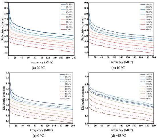 As shown in Figure 7, within the frequency range of 1–200 MHz, the dielectric constant of maize kernel samples with the same moisture content decreases as the frequency increases under identical temperature conditions. This trend is consistent across varying moisture contents and temperatures. In the 1–50 MHz range, the dielectric constant decreases rapidly with frequency, while between 50 and 200 MHz, the decrease becomes more gradual and approximately linear. Under the same temperature conditions, the dielectric constant curves for samples with different moisture contents do not overlap, with samples containing higher moisture showing larger dielectric constant values.