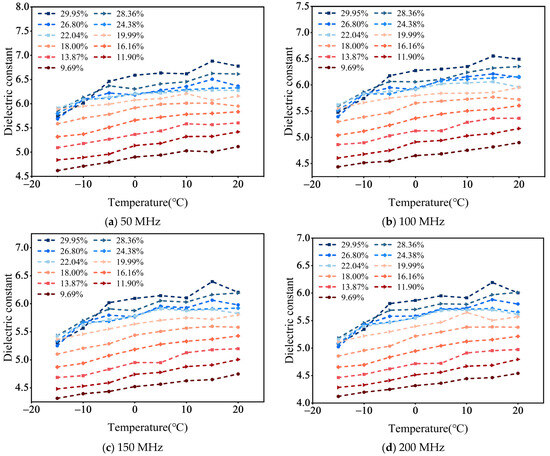 The relationship curve between maize kernel temperature and dielectric constant at different moisture contents for four frequency points: (a) 50 MHz, (b) 100 MHz, (c) 150 MHz, and (d) 200 MHz.