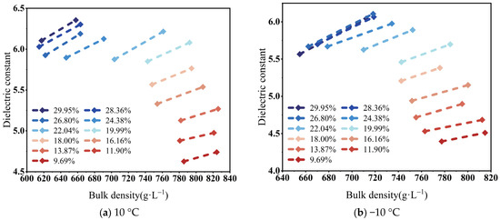 The relationship between the volume density of maize kernels with different moisture contents and the dielectric constant: (a) 10 °C; (b) −10 °C.