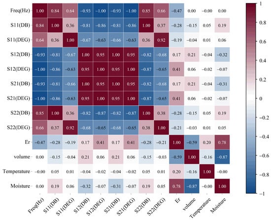 The previous section examined the relationship between the moisture content and dielectric constant of maize kernels. To further investigate the relationship between the original scattering parameters and the moisture content of maize kernels, and to enhance the accuracy of the moisture content prediction model, the scattering parameters of maize kernels were included for correlation analysis.