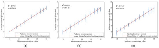 Performance of the moisture content prediction model: (a) SPO-SVM; (b) XGBoost; (c) GA-BP.