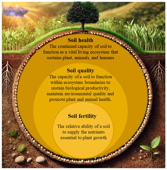 As illustrated in Figure 1, soil health, quality, and fertility are interconnected yet distinct concepts, each contributing to the overall functionality of agricultural ecosystems. Soil health is the broadest concept, encompassing the biological, physical, and chemical functions that sustain plants, animals, and humans. Within this framework, soil quality refers to the soil’s ability to support productivity and ecosystem functions. In contrast, soil fertility, a subset of soil quality, focuses specifically on nutrient availability for plant growth [10].